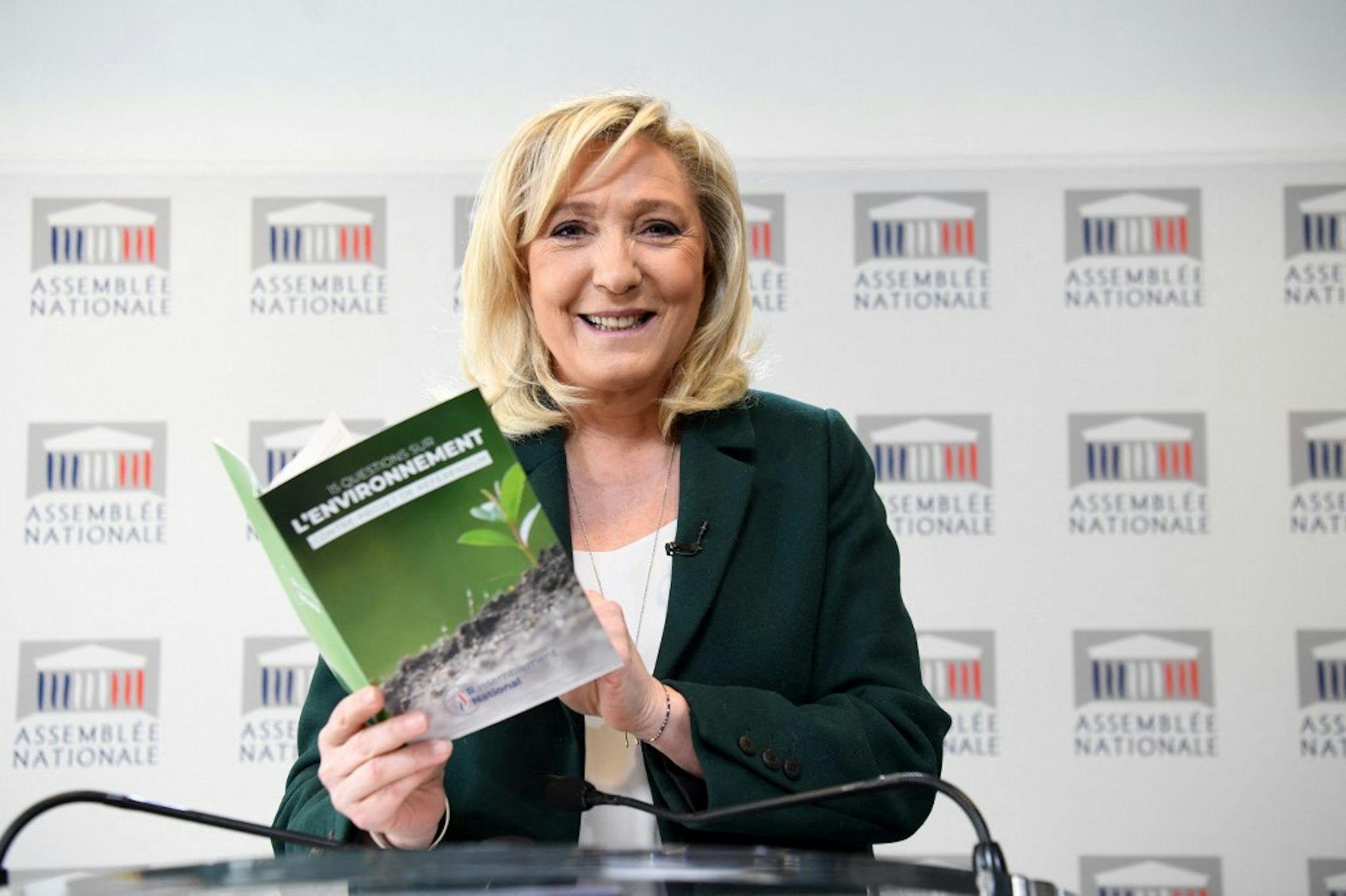 Marine Le Pen tient à la main une brochure sur sa contre-proposition au projet d'amendement constitutionnel incluant le devoir de lutter contre le changement climatique, le 9 mars 2021.