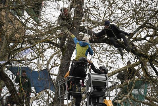Des personnes occupaient l'un des derniers bois situé sur le tracé de la future autoroute, à Saïx (Tarn) le 20 février 2024.