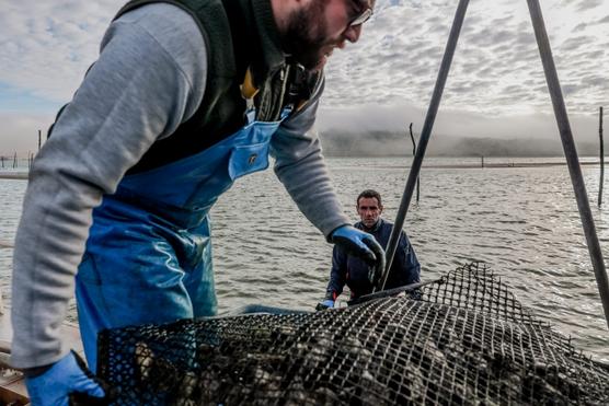 Des ostréiculteurs du bassin d’Arcachon (Gironde) remettent en place quatre tonnes d’huîtres sur le banc d’Arguin, le 30 décembre 2023. Guillaume BONNAUD / PHOTOPQR/SUD OUEST/MAXPPP
