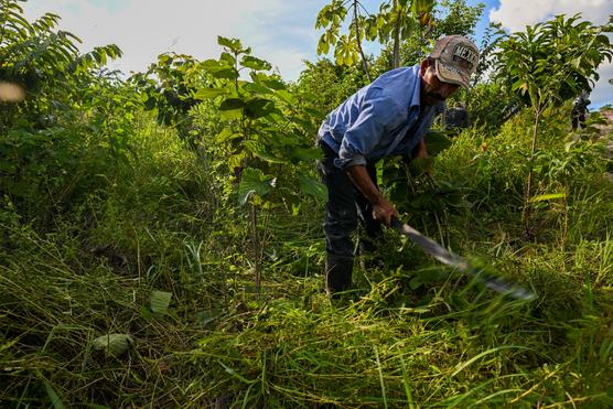 Un résident coupe l’herbe autour des nouveaux arbres plantés dans une zone récupérée de l’élevage illégal de bétail, dans le secteur de La Colorada, au sein de la réserve de biosphère maya, dans la région du Petén (Guatemala), le 5 octobre 2023.