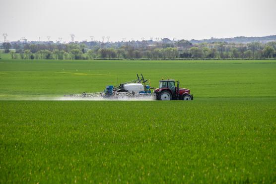 Pulvérisation de produits phytosanitaires sur un champ de blé à Saint-Rogatien (Charente-Maritime), le 1ᵉʳ avril 2021.