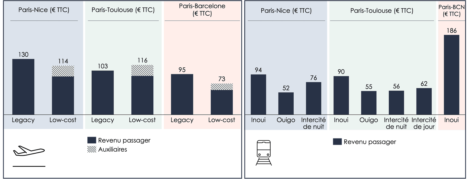 Le train est moins cher que l'avion pour les trajets nationaux directs mais cet ordre s'inverse pour l'international