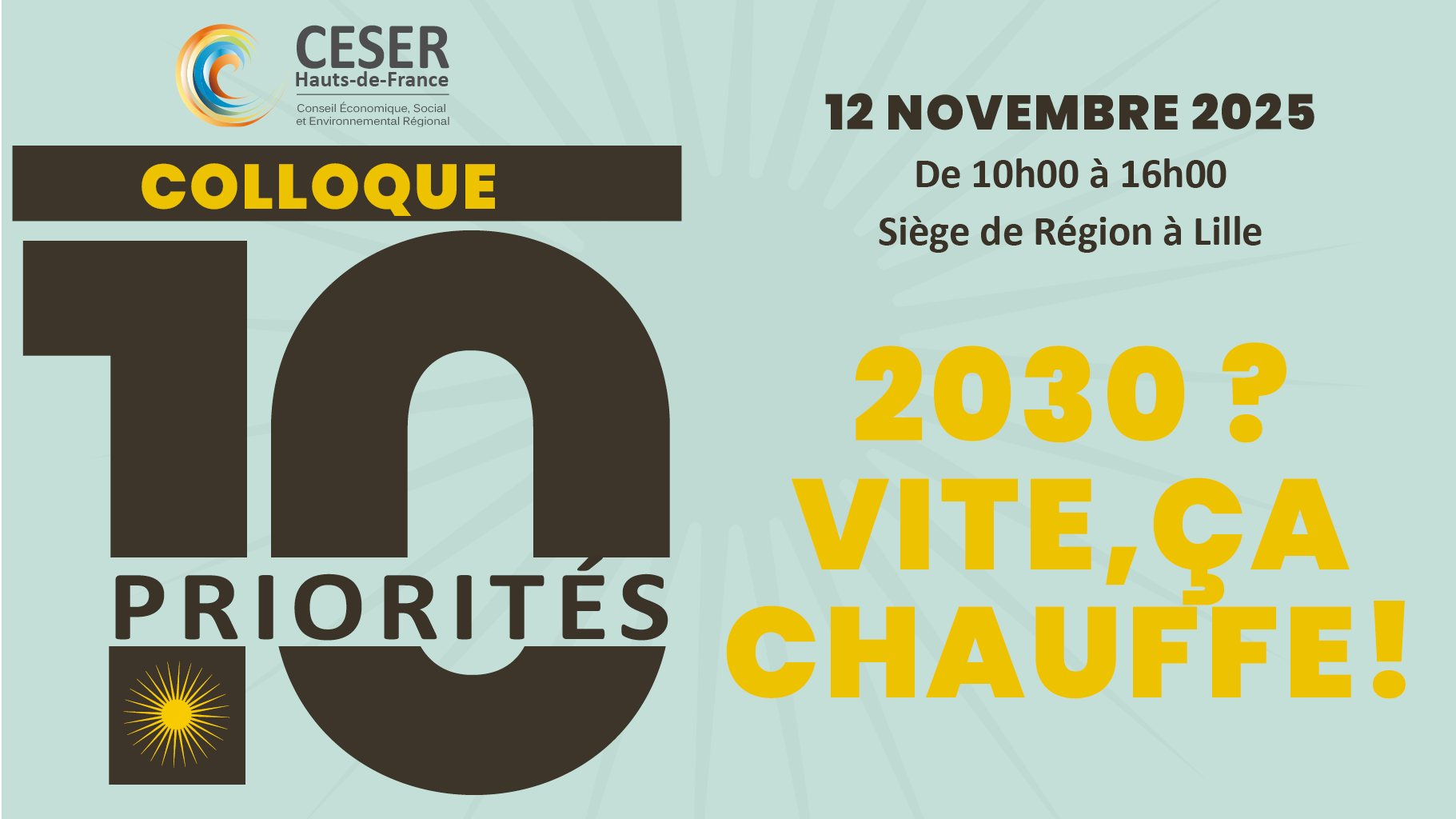 Le CESER Hauts-de-France, dans le cadre de ce colloque, dévoilera les 10 priorités qui détermineront dès demain les conditions de vie de tous les habitants d'ici 2050.