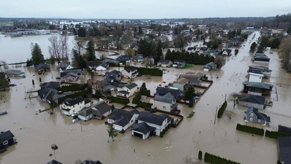 Des zones inondées dans la ville de Sumas, dans l’Etat de Washington, à la frontière des Etats-Unis avec le Canada, le 11 décembre 2025. JESSE WINTER/REUTERS