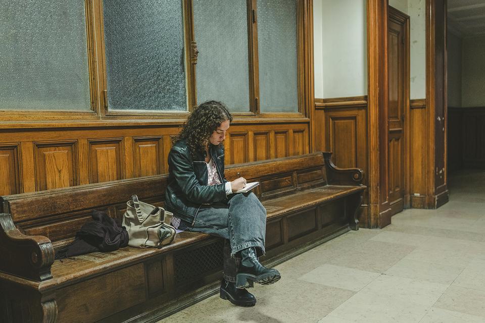 Jeanne, illustratrice pour l’association MSDE, lors d’un procès au tribunal de Paris, en novembre 2025.