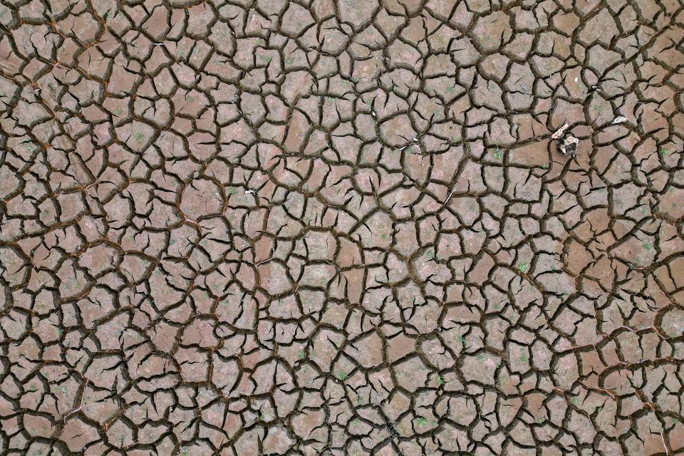 Une vue aérienne du sol craquelé d’une zone auparavant immergée, lors d’une sécheresse, à Joanopolis (Brésil), le 11 décembre 2025. NELSON ALMEIDA/AFP
