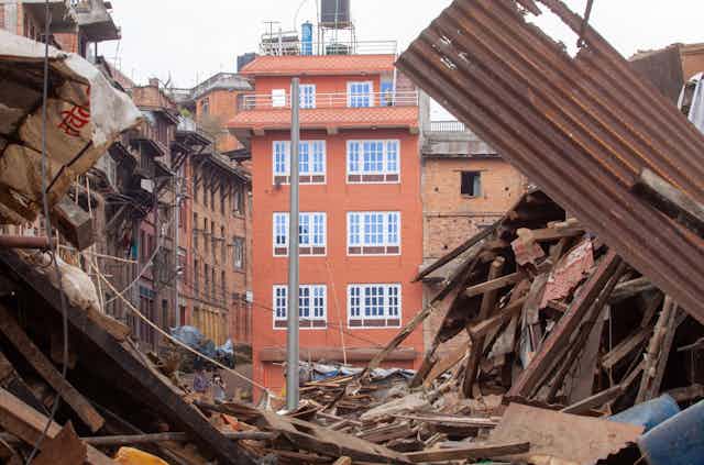 Un bâtiment partiellement effondré, détruit par le tremblement de terre à Bhakatapur, au Népal le 25 avril 2015.