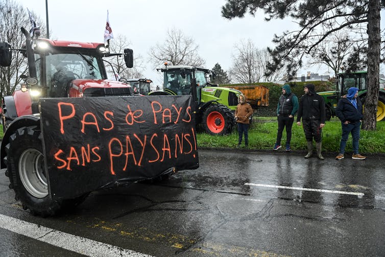 Des agriculteurs devant la préfecture de Rennes, dans l’ouest de la France, le 21 février 2024, lors d’un rassemblement pour exiger de vraies annonces du gouvernement avant le début du Salon de l’Agriculture. Sébastien Salom-Gomis/AFP