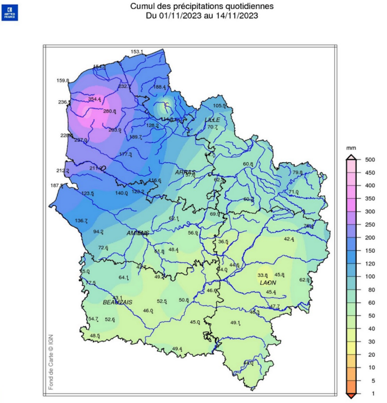 Météo France Nord a établi une carte du cumul des précipitations durant la 1ere quinzaine de novembre 2023. Le maximum d’intensité était concentré sur le haut-Boulonnais, d’où partent les sources des principaux cours d’eau naturels. Météo France, Fourni par l'auteur