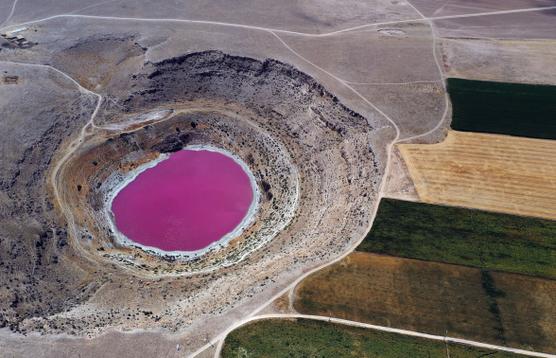 Le lac Meyil Obruk, dont l’eau est devenue rose en raison de la température et de facteurs géologiques, dans la province de Konya (Turquie), le 21 août 2020. ABDULLAH COSKUN / ANADOLU VIA AFP