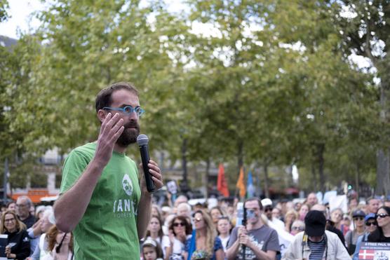 Sylvain Angerand, de l’association Canopée, lors du rassemblement pour demander la libération de l’activiste Paul Watson, emprisonné au Groenland, à Paris, mercredi 4 septembre 2024. Félix GRAUMER/SIPA