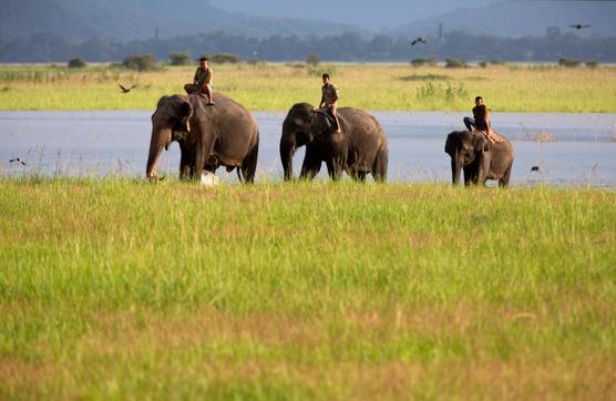 Des éléphants traversent une rivière dans le village de Khola Bhuyan village, dans l’étatde l’Assam, en Inde, en 2017.