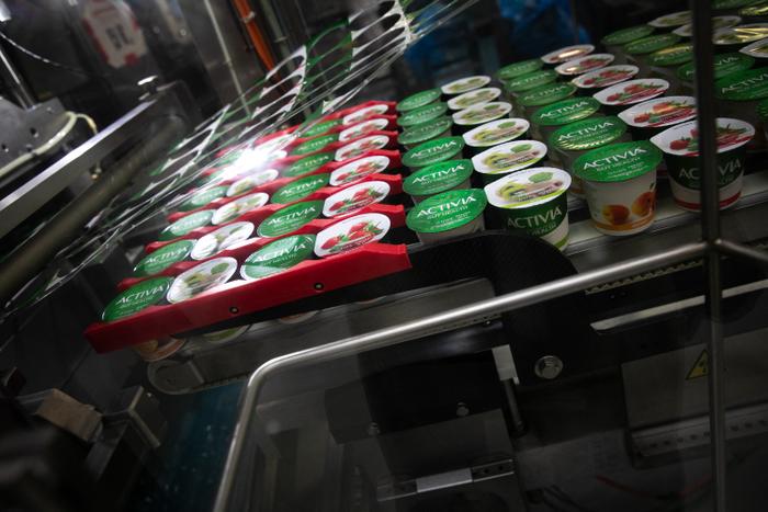 Une ligne de production de yaourts de Danone, à Ferrières-en-Bray (Seine-Maritime), le 19 mars 2023. Lou BENOIST / AFP