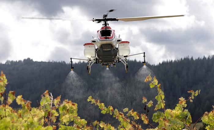 Un drone RMAX effectue un vol d’essai de pulvérisation sur des vignes, à Oakville, en Californie, en 2014.
