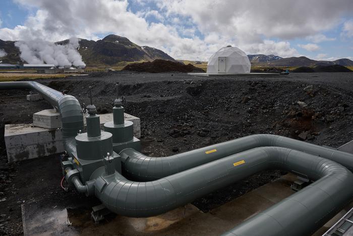L’usine de la start-up suisse Climeworks à Hellisheidi, en Islande, le 8 mai 2024. HALLDOR KOLBEINS / AFP