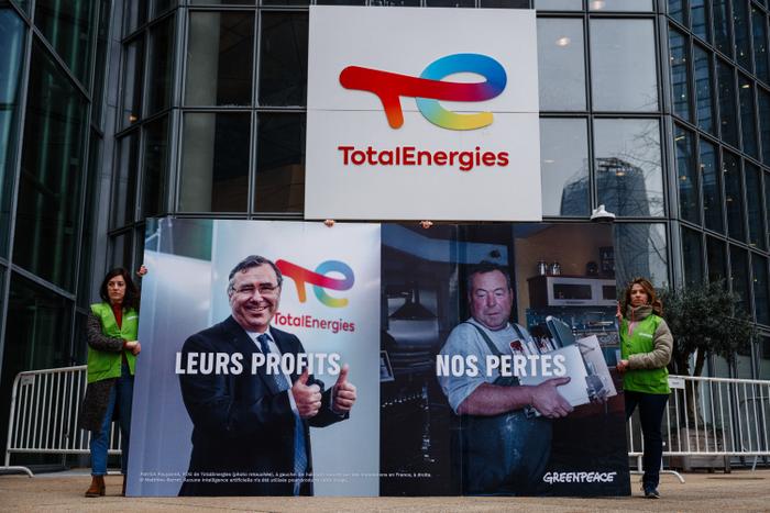 Une manifestation organisée par des militants de Greenpeace devant le siège de TotalEnergies, à La Défense, dans les Hauts-de-Seine, le 5 février 2024. DIMITAR DILKOFF/AFP