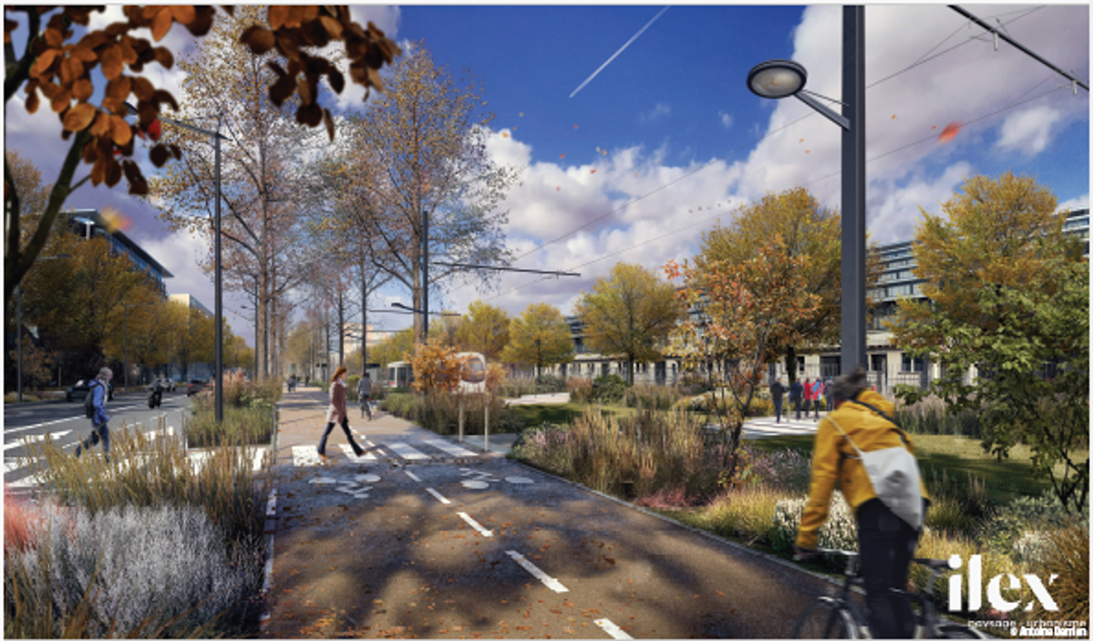 Perspective de la rue Mérieux à Lyon (7ᵉ) dans la végétalisation du tramway T10. Ilex Paysage & Urbanisme et SYTRAL Mobilités en tant que maître d’ouvrage du projet T10, Fourni par l'auteur