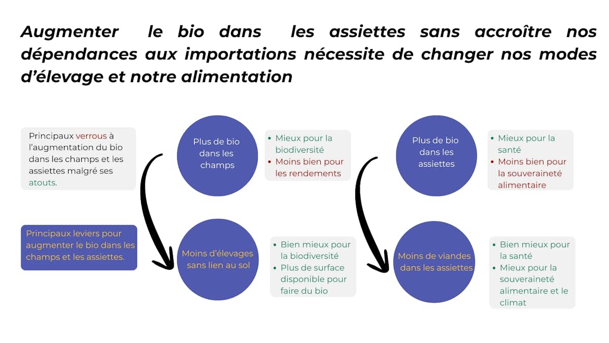 Une agriculture française 100 % bio serait meilleure pour notre santé et celle de l’environnement. On pourrait arriver à cette généralisation du bio si l’on réduisait notre consommation de viande. Ce qui aurait également des effets bénéfiques pour notre santé.