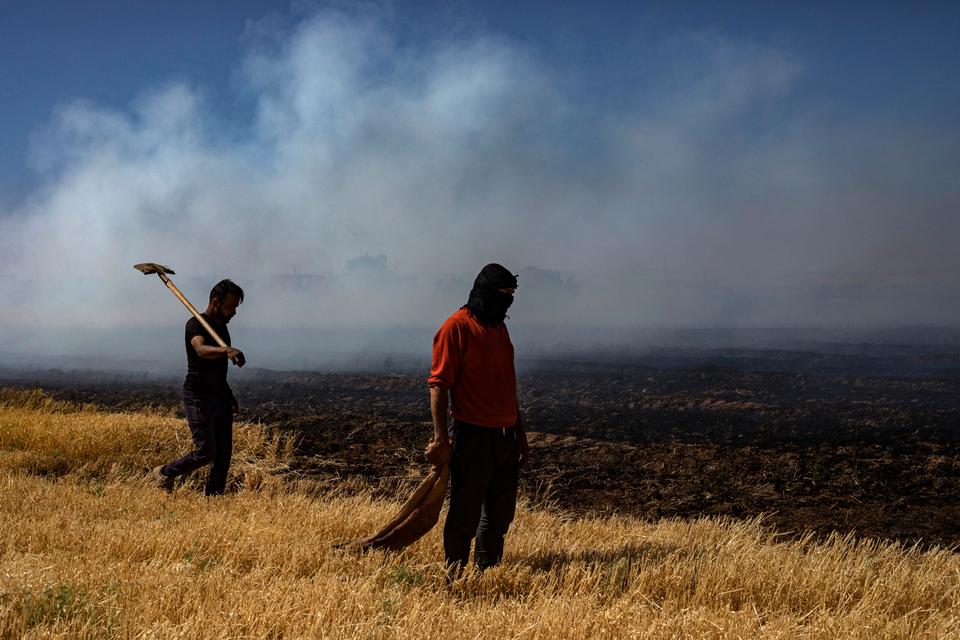 Dans un champ de blé partiellement détruit par un incendie, à Kamechliyé (Syrie), pendant une forte sécheresse, le 2 juin 2025. DELIL SOULEIMAN/AFP